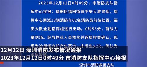 據了解,12月12日零時49分,深圳市消防支隊指揮中心接到報警稱,位于福田區福田街道的平安大廈冒煙疑似起火。接警之后該支隊立刻調派13輛消防車以及62名消防員前往現場處置警情,消防員于零點55分到達現場,后續與物業人員核實并且逐層排查確認。現場的煙霧是冷卻塔產生蒸汽導致,并沒有發生火災,確認此前報警電話為虛假警情。