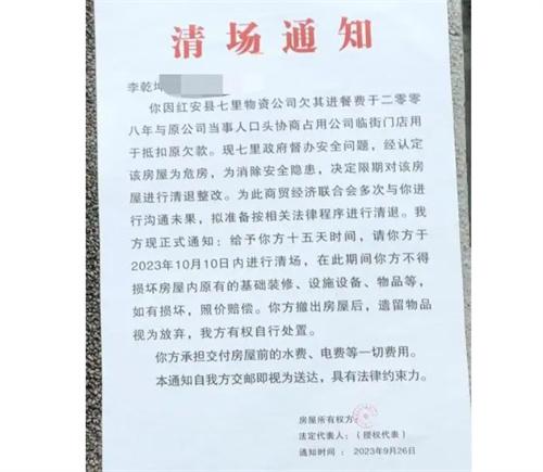 2023年的九月份,李某占用的這棟房屋被認定為危房,紅安縣商貿經濟聯合會找到李某,要求李某對房屋內的各種物品清場。但是一直都沒有針對就餐欠款問題與李某達成一致,李某并沒有同意清償,七里坪鎮政府綜治辦工作人員告訴記者,鎮政府目前已經介入雙方的糾紛中調解,但是調解結果始終不如人意。