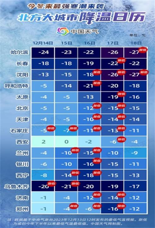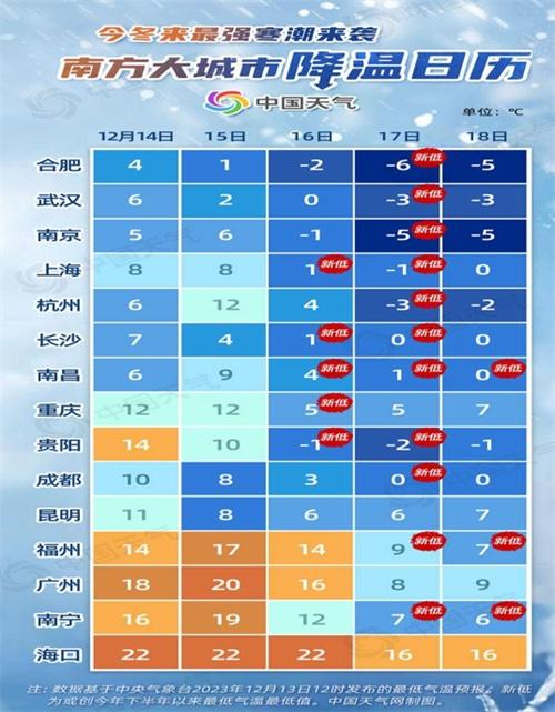 北京時間12月13號,根據中國天氣網發布的消息稱,今年入冬以來最強的寒潮目前已經啟動,這一次的很長時間將會持續到12月16號,而且寒潮的目標將會從西方往東方,從北方往南方的方向去進行,我國部分城市的氣溫下降程度可能會有14℃左右。對于一些北方城市來說,這一次氣溫下降,有可能會突破所在城市的一個極值,而南方地區極有可能會出現氣溫大幅度的下降,在此要提醒所有的市民朋友們,一定要做好防寒保暖。