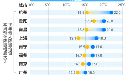 記者統計了全國31個省會城市及直轄市的天氣預報數據,發現杭州、貴陽在內的部分南方城市迎來大降溫,48小時之內最高降幅達到20攝氏度左右。記者搜集了1951年到2022年的溫度數據,發現杭州、南京、上海、廣州在內的8個城市本次降溫幅度超過往年最大降幅均值,通過對歷年數據進行匯總,能得出一個結論:中國城市的入冬在推遲。