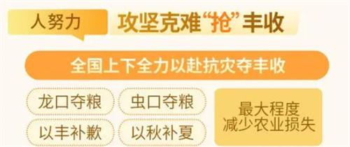 很多人都在好奇2023年夏天、秋天自然災害多發頻發,老百姓的糧食生產為什么還能夠獲得大豐收,這主要是基于政策好,政府以真金白銀的方式惠糧農。夏天雨水災害頻發提高小麥、稻谷的最低收購價格,完善玉米、大豆等糧食作物種植者補貼,增加產糧大縣的資金獎勵規模,向實際種糧的農民發放一次性補貼高達100億元,災害頻發期全國上下一起努力抗災奪豐收,最大程度減少了農業損失。