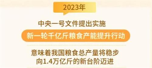 兩提分別是提單產、提自給量,全國的糧食單產已經合到每畝389.7公斤,相較于2022年每畝增加了2.9公斤,口糧自給率進入2023年之后已經在100%以上,各種谷物的基本自給口糧絕對安全。