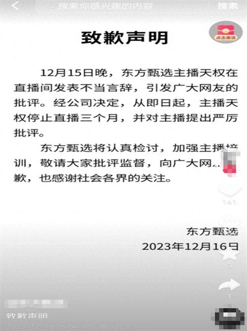 時間沒過多久,東方甄選對于主播天權(quán)的行為給出了嚴(yán)厲的處罰,并對外發(fā)布了一條對主播天權(quán)的處罰通知,處罰通知里面顯示對主播天權(quán)作出了禁止直播三個月的處罰。對主播天權(quán)特意進(jìn)行了嚴(yán)厲的批評,所有被天權(quán)拉黑的網(wǎng)友們目前已經(jīng)全部被解除了,歡迎這些網(wǎng)友們能夠繼續(xù)對新東方提出建議以及批評,在未來東方甄選將增加對主播的培訓(xùn),希望廣大網(wǎng)友能夠繼續(xù)對我們監(jiān)督。