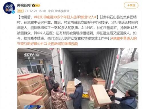 12月份的甘肅氣溫是非常低的,在面臨資源緊缺的情況下,全國各地的救援力量都第一時間聚集,面對危難時刻從沒有退縮,劉集鄉團結村的這一眾年輕人給村里的鄉親父老帶來了更多希望,也成了當時最亮麗的一道風景線。在救災現場的群眾一定要注意安全,注意余震的發生,相信經通過大家的幫助一定能夠重建家園。