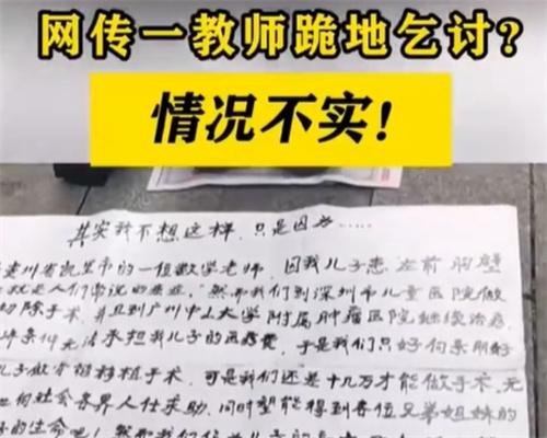 12月27日,一位來自深圳的教師跪地乞討在網上登上了熱搜,而在整個社交平臺當中有多個網帖發布深圳一中年數學教師為了救重病的兒子而跪地乞討。這個內容當中的圖片當中展現的是一位身著西裝男子當街跪地,面前則擺著幾套用的一些紙板文案以及收款的二維碼等一些物品。經過詳細的調查,該情況不屬實,同時經網上對比,帖文中該男子乞討所用的紙板文案是與當時2021年的一媒體報道外地跪地男教師的事件中的紙板文案相一致。