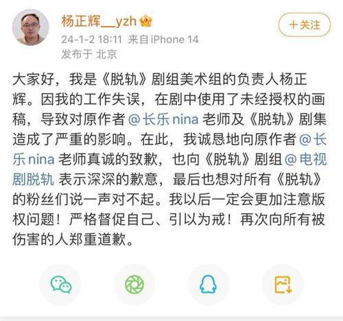 在1月2號(hào),劇組美術(shù)組的楊正輝正式進(jìn)行了道歉,并表示是因?yàn)樗氖д`導(dǎo)致了在劇情當(dāng)中出現(xiàn)了未經(jīng)授權(quán)的畫稿,對(duì)于畫稿的原作者以及脫軌這部電視劇造成了非常嚴(yán)重的影響,他也誠懇的向作者進(jìn)行致歉。對(duì)所有喜愛這部電視劇的粉絲進(jìn)行道歉,并表示自己以后一定會(huì)更加注意版權(quán)上的問題,總的來說,這件事情可以歸結(jié)為版權(quán)問題。