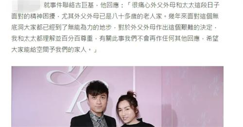 近日,古巨基的岳父公開發布聲明,宣布與兒子斷絕父子關系,導致其做出此決策的主要原因來自于一場賭博風波,古巨基的小舅子因涉嫌賭博并卷入欠債風波,導致一家人為其操碎了心。面對岳父所作出的重大決定,古巨基出面回應表示自己非常理解和尊重岳父岳母所作出的決定。