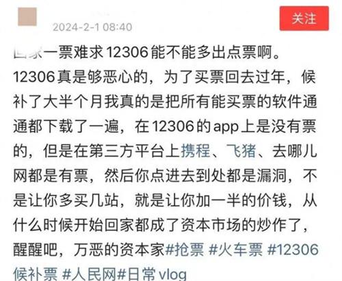 近日,春節(jié)期間有部分網(wǎng)友在網(wǎng)上發(fā)帖稱,很多人搶不到回家的票,之所以出現(xiàn)這樣的情況,主要是因?yàn)殍F路只放長(zhǎng)途票,并沒(méi)有將短途票放出來(lái)。從這位網(wǎng)友曬出的照片畫面來(lái)看,12306平臺(tái)上2月5日的列車班次顯示,從上海虹橋到長(zhǎng)沙有多趟列車有余票,但是杭州到長(zhǎng)沙的車票已經(jīng)全部賣光,然而杭州卻是上海到長(zhǎng)沙的途經(jīng)站,途經(jīng)站無(wú)票起點(diǎn)站有票,這種情況就引起很多網(wǎng)友的質(zhì)疑。