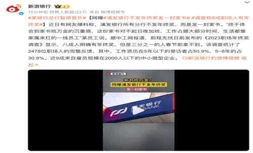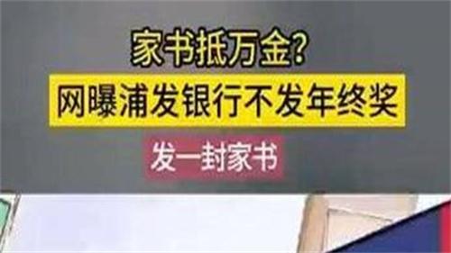 近日,有網友表示浦發銀行近期宣布取消年終獎,取而代之的是向員工發放一封家書。所謂家書抵萬金,但是這一舉動迅速引發網友熱議,不少人表示難以理解公司的決定。