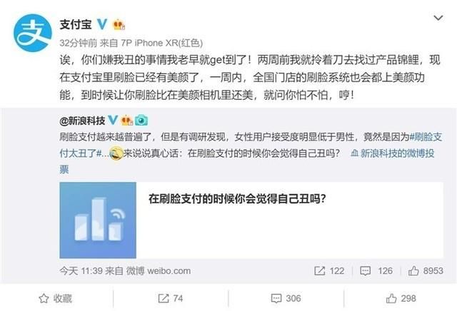 經過調查,大多數女性用戶不愿意使用刷臉支付原因出奇的一致,都是因為在刷臉支付時的取景框中沒有提供美顏效果,所以才比較抗拒該功能。支付寶刷臉支付將上線美顏效果對此,支付寶官方剛剛在微博表示,現在手機端的支付寶里刷臉已經支持美顏,一周內,全國門店的刷臉系統也會都用上美顏功能。