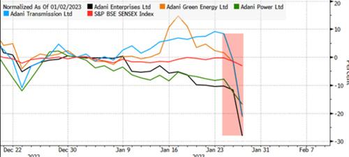 1月27日Adani Group的旗艦上市公司Adani Enterprises的股票出現了18.5%的下跌幅度,這一下跌幅度創造了2017年以來的最大跌幅,Adani Group旗下的其他公司的股票也都出現了大幅度的下跌其中Adani Green Energy Ltd和Adani Total Gas的跌幅已經超過了20%處于跌停狀態,Adani 旗下的公司股票成交量也出現了大幅度的上漲,是近三個月以來平均水平的三倍還要多,使得印度整個股市都被其所波及印度的Nifty 50指數的跌幅已經創下了2021年10月份以來的最低點。