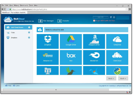 在撰寫本文時,MultCloud支持兩種以上的服務或選項:Dropbox,Google Drive,Amazon Drive,OneDrive,Amazon S3,Box,MediaFire,OwnCloud,FTP,SugarSync,Copy,Alresco,Flickr,MySQL,HubiC,WebDav, CloudMe,Cubby和myDrive。