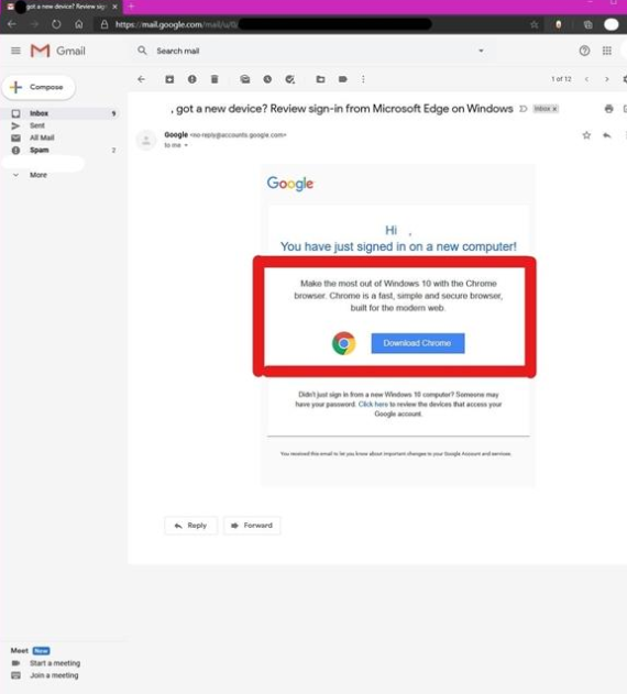 據(jù)悉,該郵件雖然表面上是警告用戶在新電腦上登陸了Gmail,但點開郵件后大部分內容是Chrome瀏覽器的廣告,并且還附贈了一個下載鏈接。