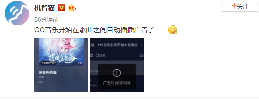 不過微博用戶@機(jī)智貓爆料稱,QQ音樂現(xiàn)在會在歌曲之間自動插播廣告,這就不一樣了。