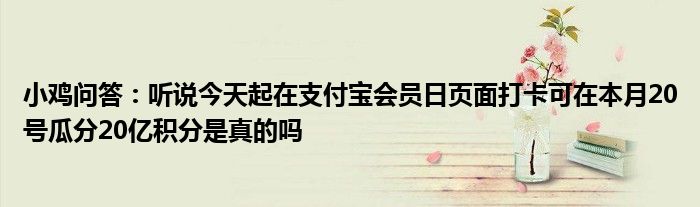 關于到現在小雞問答:聽說今天起在支付寶會員日頁面打卡可在本月20號瓜分20億積分是真的嗎這個話題,相信很多小伙伴都是非常有興趣了解的吧,因為這個話題也是近期非常火熱的,那么既然現在大家都想要知道小雞問答:聽說今天起在支付寶會員日頁面打卡可在本月20號瓜分20億積分是真的嗎,小編也是到網上收集了一些與小雞問答:聽說今天起在支付寶會員日頁面打卡可在本月20號瓜分20億積分是真的嗎相關的信息,那么下面分享給大家一起了解下吧。