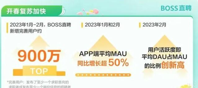 進入2023年之后,在春節過完,人才市場的需求逐漸回暖,再加上春招是一個非常利好的因素,boss直聘的用戶也擁有了快速的增長,在2023年的1月份到2月份這兩個月之間,公司新增完善用戶達到了900萬人,在這兩個月期間用戶在boss直聘的活躍度也創下了新高。