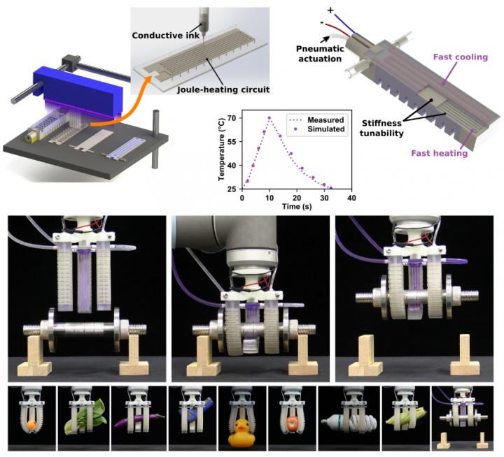 為了證明他們方法的成功,該團(tuán)隊(duì)設(shè)計(jì)了一個(gè)帶有三個(gè)FRST執(zhí)行器的機(jī)器人抓手,可以抓住和提升任意形狀的物體,各種重量從不到10克到1.5千克,Ge說。他補(bǔ)充說,他們使用計(jì)算模型來模擬FRST執(zhí)行器的機(jī)械和熱電行為,以指導(dǎo)其設(shè)計(jì)并提供增強(qiáng)負(fù)載能力的見解。