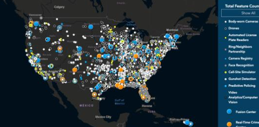 與我們每天檢查的當前局勢儀表板相比,它的界面更干凈,更簡單,并且一目了然,向您顯示警察在使用人體攝像頭,無人機,自動車牌閱讀器,Ring / Neighbors應用程序,攝像頭注冊表,面部識別,單元站點模擬器,槍擊檢測,預測性策略,“視頻分析/計算機視覺”,融合中心和實時犯罪中心。