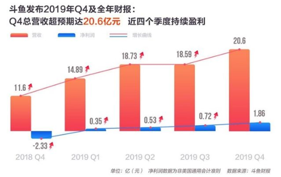 斗魚發布了2019年第四季度及2019年全年未經審計的財務報告。財報顯示,2019年第四季度,斗魚總營收達20.6億元,較2018年同期增長77.8%,毛利潤同比增長超9倍,毛利率從去年同期的3.1%猛增至18.2%。非美國通用會計準則下錄得凈利潤1.86億元,較去年同期增長180%,連續四個季度盈利。