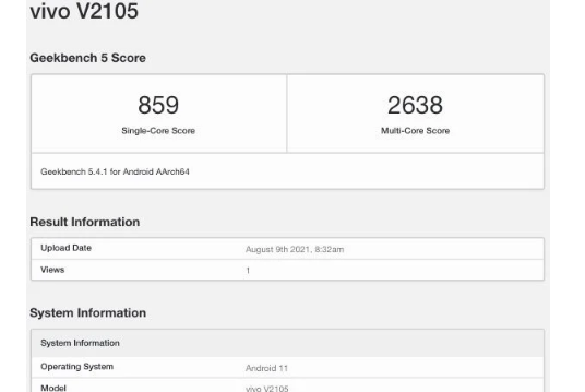 V2105 Vivo 智能手機的 Geekbench 列表顯示它由聯發科天璣 1200芯片提供支持。在列表中提到了 SoC 及其 MT6893Z_C/CZA 型號。