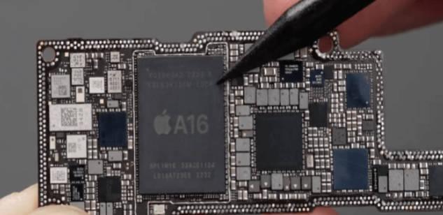 使用的元器件名單方面,蘋果使用A16處理器,型號為APL1W10/339S01104,64位六核+5核GPU,臺積電6納米工藝代工,這種工藝和三星K3LK2K20CM-EGCP 6GB LPDDR5 SDRAM內存相似,通過POP堆疊在手機后蓋。