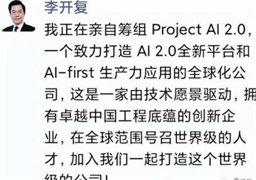 李開富發(fā)朋友圈稱要開始籌備新公司,新公司的目標(biāo)就是大模型領(lǐng)域。發(fā)文中,李開復(fù)表示正在親自進行 Project AI 2.0的重組,將集中力量建立一個全新的 AI2.0的平臺,進行AI- first生產(chǎn)力應(yīng)用的實現(xiàn)全球化的公司。新公司將采用的是技術(shù)愿景進行驅(qū)動,所擁有的中國工程的底蘊將會非常卓越,是一個全新的進行創(chuàng)新的企業(yè)。新公司會在全球的范圍內(nèi)召集人才,希望來自世界各地的高級人才,能夠參與到這個世界級的公司的建造過程中來。