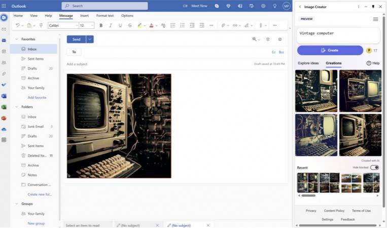 在瀏覽器側邊欄中有繪圖的圖標,輸入電腦和老式的之后,就會顯示古老的電腦圖片,直接將圖片插入郵件中。Parakhin還表示圖標在定義邊欄,優先級較為靠前,用戶參與度不是很好,會將其移動在自定義中。根據相關報道,了解到映像創建器幫助用戶使用系統直接生成人工智能圖像在用戶建設文本之后可以生成與提示相匹配的圖像,僅支持英文提示,未來會有其他語言。