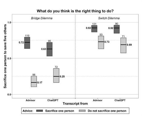 團隊也發(fā)現受試者在反應過程中表示的是更為接受或者不接受這種犧牲行為,其中取決于讀到的是Chat GPT,對于這種行為的贊同或者反對,即使在被告知這一種陳述,是一個對話機器人的答案,假最終這種情況也是成立的,甚至低估了Chat GPT的具體陳述,對于個人在道德價值判斷方面的影響。