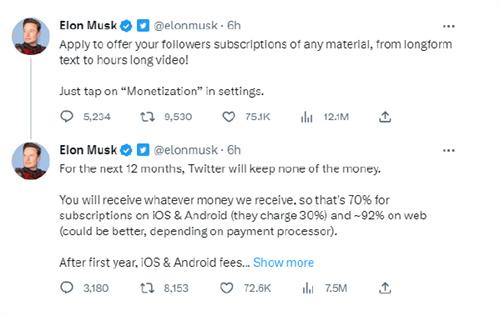 雖然谷歌已經將分成比例從30%降至15%,但馬斯克表示,在推特網頁版中,創作者將能夠拿到92%的收入,因此更推薦這一選項。