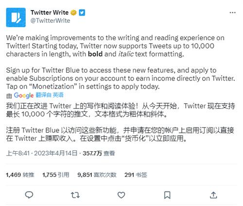 推特于北京時間4月14日晚間發布消息稱,允許推特付費的用戶發布的推文字符長度可以達到1萬個。推特發布了一份聲明,表示目前正在對推特的閱讀和寫作的體驗進行改進支持,用戶發布長度不超過1萬字符的推文,推文中支持斜體文本和粗體文本的格式。注冊Twitter Blue的用戶可以現在就可以使用這一新的功能。