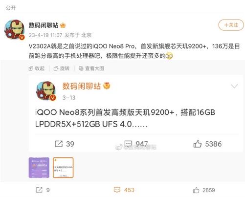 同時(shí),爆料博主 @數(shù)碼閑聊站也爆出了這個(gè)消息,并稱V2302A就是之前提到的iQOO Neo8 Pro,搭載首發(fā)的新旗艦芯片——天璣9200+。數(shù)碼閑聊站在爆料中表示,這顆芯片跑分達(dá)到了136萬,是目前跑分最高的手機(jī)處理器,其性能也將得到極大提升。