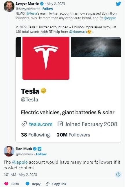 據報道,特斯拉CEO埃隆·馬斯克回應了電動汽車分析師索耶·梅里特在推特上的一條推文。梅里特指出,特斯拉的推特主賬戶擁有超過2000萬粉絲,是其他任何汽車品牌的四倍,是蘋果的兩倍。對此,馬斯克表示,如果蘋果也在推特上發布內容,他們的賬號將擁有更多粉絲。