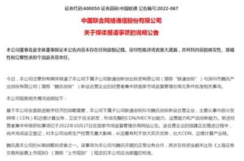 根據去年11月2日聯通所發布的公告,能夠看到組建這些公司,長遠方面對雙方都是十分具有優勢的,中國聯通也認為騰訊公司是作為長期的戰略合作伙伴,這一次的事項則是公司和騰訊之間正常所開展的一項合作類的業務,其投資金額并沒有達到能夠上市的要求規則應該去披露的這一標準。