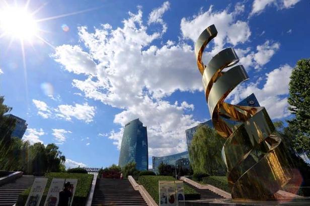 位于中關村廣場上的《生命》雙螺旋雕塑,熠熠生輝,象征著中關村人生生不息、探索未知的開拓精神。這個雕塑與周圍的高層建筑和綠樹噴泉相互映襯,在藍天白云的襯托下,展現出中關村的勃勃生機和活力。