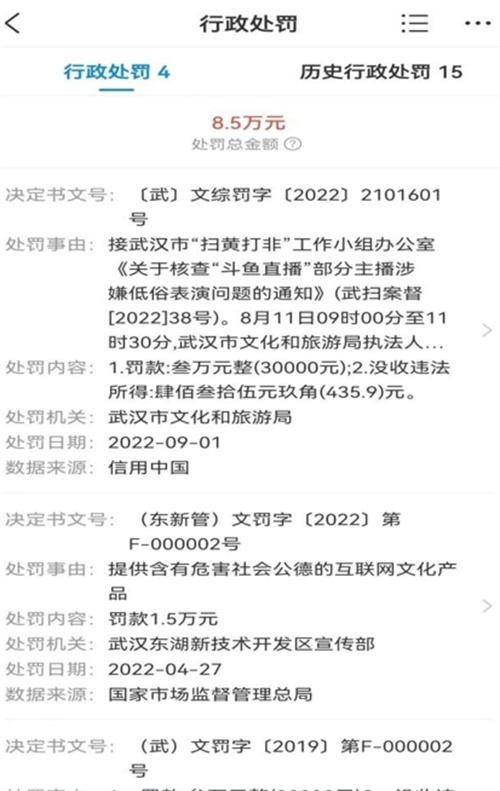 斗魚已經因為相關的問題多次遭到行政方面的處罰,目前在斗魚公司中處罰條款一共有4條行政的處罰,15條歷史上的行政處罰。2019年到2022年這期間,因為表演的方式過于低俗造成了違規,武漢市文化旅游局針對斗魚作出了處罰,共計罰款8.5萬元。