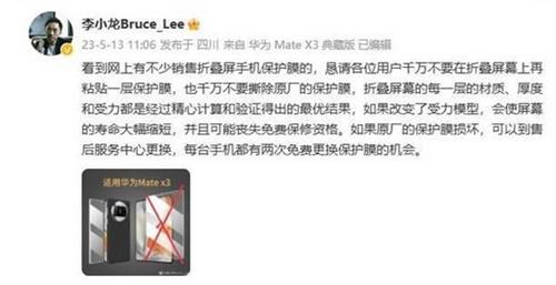 華為高管、終端BG CTO李小龍今日發文提醒用戶,在網上有很多銷售折疊屏手機保護膜的情況下,千萬不要在折疊屏幕上再次貼上一層保護膜,并且也不要撕掉原廠提供的保護膜。