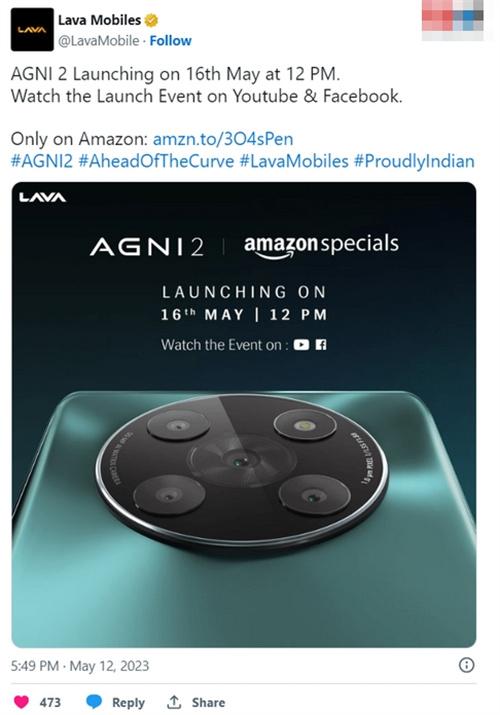 5月13日消息,Lava公司宣布Agni 2智能手機(jī)的發(fā)布日期為5月16日,并向我們展示了該手機(jī)的后置相機(jī)模組設(shè)計(jì)。