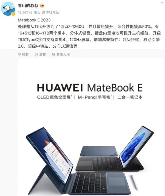5月13日消息,華為在2021年推出了上一代MateBook E 二合一筆記本,搭載了英特爾11代酷睿處理器和12.6英寸OLED全面屏。近日,據爆料博主“看山的叔叔”透露,華為MateBook E 2023二合一筆記本曝光,配置升級到i7-1260U處理器。