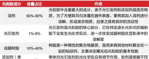 光刻膠是一個大家庭的稱呼,從低到高分成多個層級,在上游材料中利用的是感光劑,樹脂、溶劑以及單體,光刻膠每一種產品在配方和組成方面有著極大的不同,原材料成本占據的比例和自給自足的比率也是完全不同的。
