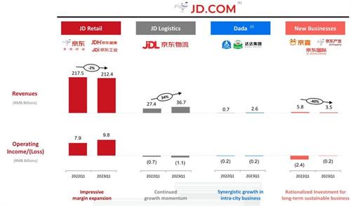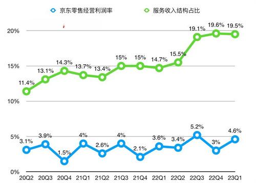 根據京東上周發布的第一季度財報能夠看到在宏觀消費趨勢的影響之下零售這一板塊營收方面有負增長的情況并沒有跑贏網絡零售大盤現象,網絡零售是京東最重要的一項業務,其中包括了電商,京東健康以及京東工業,而另一方面這一零售業務的利潤保持在了4.6%,一直是在歷史高位位置。