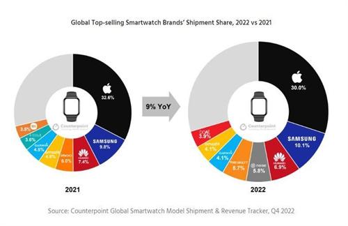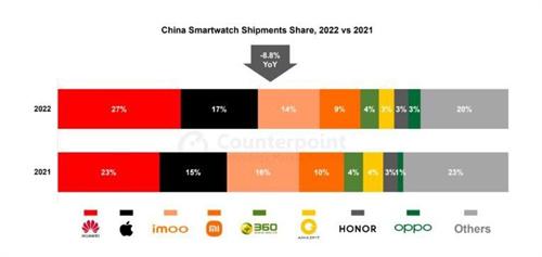 2022年全球范圍內(nèi),智能手機(jī)整個(gè)出貨數(shù)量一舉跌破了歷史最低點(diǎn),同比有12%的下滑。也創(chuàng)下了2013年以來智能手機(jī)更換數(shù)量最差的年度業(yè)績(jī),2022年在全球范圍內(nèi)智能手表的市場(chǎng),總出貨數(shù)量已經(jīng)達(dá)到了1.43億臺(tái),在出貨量方面同比增長(zhǎng)量達(dá)到12%。
