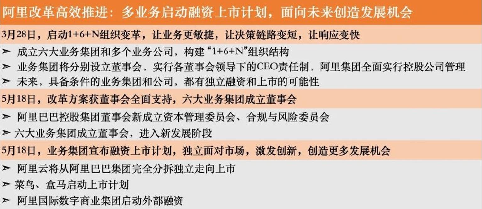 5月18日阿里巴巴將2023年財年的財報正式公布,相比較財務數據方面更讓科技行業和資本圈關注的是對于旗下六大業務集團和盒馬正式上市路線進行了公布。阿里巴巴的員工對這次所公布的內容有一些意外,不久前3月28日,張勇通過全員信將1+6+N組織變革形式正式宣布,從宣布組織發生變革到將上市計劃啟動這中間僅僅只有50天的間隔時間。