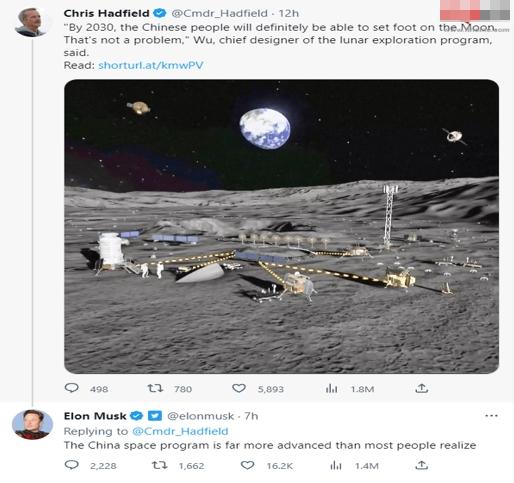 加拿大宇航員克里斯·哈德費(fèi)爾德在推文下轉(zhuǎn)發(fā)了CGTN的一篇報(bào)道,報(bào)道中提到中國(guó)探月工程總設(shè)計(jì)師吳偉仁在4月23日接受央視采訪時(shí)表示,到2030年之前,中國(guó)人一定會(huì)在月球上留下腳印。馬斯克在哈德費(fèi)爾德的推文下評(píng)論道:“中國(guó)的太空計(jì)劃遠(yuǎn)比大多數(shù)人認(rèn)識(shí)到的更先進(jìn)。”