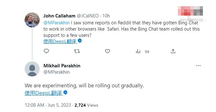 本周末,必應的Reddit頁面上出現了一個帖子,展示了必應聊天在蘋果Safari和谷歌Chrome瀏覽器中運行的截圖。IT之家通過Twitter向Parakhin確認了這一消息,他證實了該功能正在進行實驗,并表示將逐步推出。目前尚未透露具體哪些第三方瀏覽器將獲得必應聊天的支持。