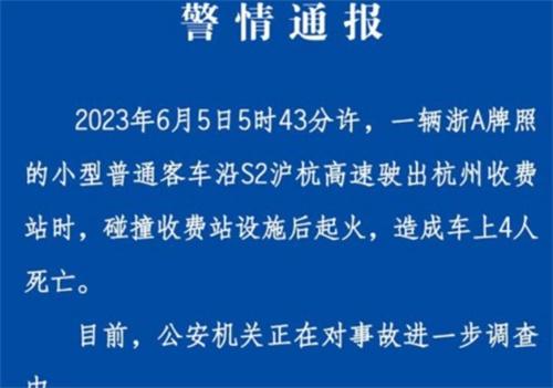 就在近期有關于新能源汽車安全的問題再次引發爭議,在北京時間2023年的6月5日杭州地區的公安局高速公路交通支隊發布公告表示。在2023年的6月5日凌晨5:43左右有一輛浙江地區客車在行駛出杭州高速公路收費站的時候,車體本身碰觸到了收費站的設施最后發生起火,最終在火勢撲滅以后發現客車上的4名乘客已經身亡,針對于起火的具體原因,目前相關部門還在進一步調查。