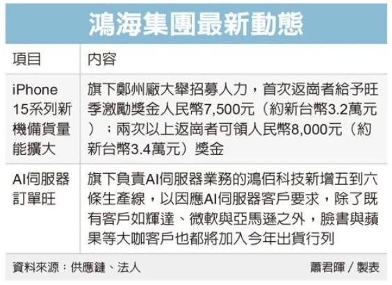 近期,蘋果即將發(fā)布iPhone 15系列新機,導(dǎo)致最大的代工廠鴻海旗下鄭州廠大規(guī)模招募人員,為首次返崗者提供旺季激勵獎金。富士康鄭州科技園區(qū)的招聘動態(tài)顯示,該廠區(qū)正在持續(xù)擴大正式員工的招聘規(guī)模,并專門招募離職返崗者。對于首次返崗者,入職底薪為人民幣2,200元,并提供旺季激勵獎金人民幣7,500元;對于多次返崗者,旺季激勵獎金可達人民幣8,000元。