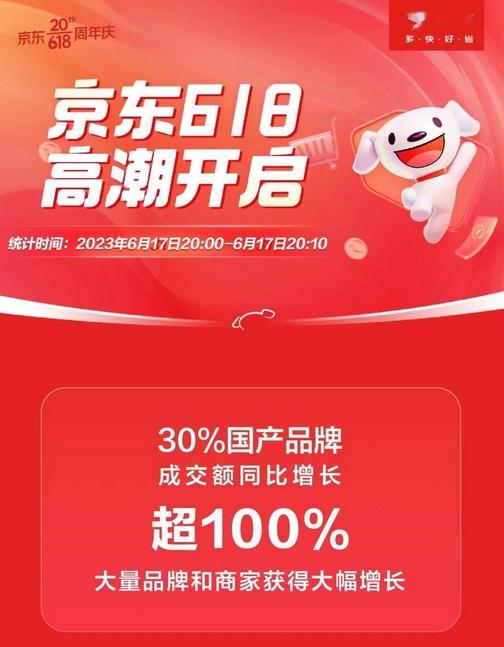 據IT之家從京東官方數據獲悉,6月17日晚8點,京東618的高潮期正式開啟。僅僅在10分鐘內,30%的國產品牌成交額同比增長了100%。
