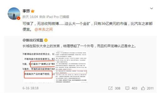 在得知理想汽車被調侃為微博之王以后,理想汽車公司的CEO理想在自己的社交平臺中表示自己感到十分的可惜,雖然平臺現在只有36億美元的市值,比汽車之家都要低依然沒有辦法收購掉微博平臺。