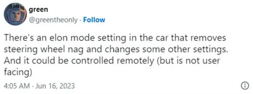 經常曝光特斯拉程序內容的黑客GreenTheOnly發現在特斯拉汽車SD最新的測試版本軟件中隱藏的一個功能叫做埃隆模式,模式的名稱是以特斯拉汽車公司的CEO埃隆馬斯克的名字來命名。據他爆料在FSD開啟埃隆模式以后,方向盤的提示功能將會自動關閉,哪怕自己的手不用碰觸方向盤,也不用擔心方向盤會提出警告或者震動,在該功能下所有的安全性能都是由特斯拉汽車內的攝像頭來監控當前司機的狀態。