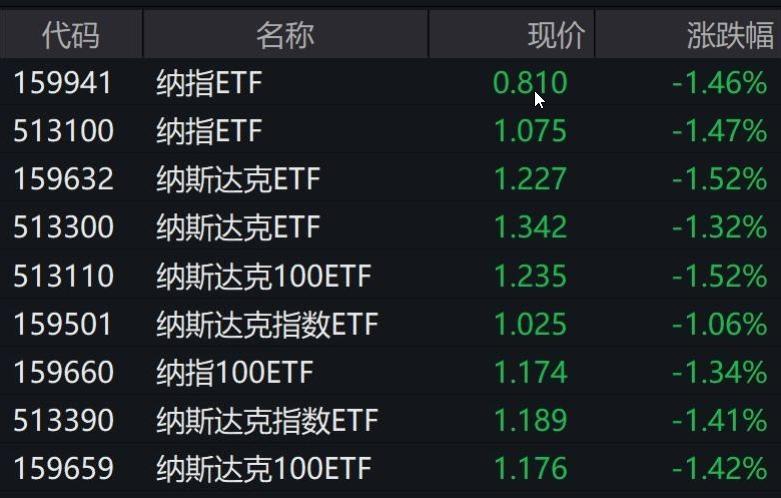 今日,場內跟蹤納斯達克指數的9只交易所交易基金(ETF)集體低開,普跌逾1%。這表明市場對于納斯達克指數的走勢持謹慎態度,投資者紛紛減少對納斯達克指數的追逐。